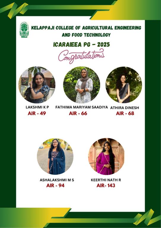 KCAEFT's Ms. Lakshmi KP (AIR-49), Ms. Fathima Mariyam Saadiya (AIR-66), Ms. Athira Dinesh (AIR-68), Ms. Ashalakshmi MS (AIR-94) and Ms. Keerthi Nath R (AIR-143) excelled in ICAR-AIEEA (PG) Entrance Exam 2025